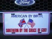 This is the American By Birth License Plate Auto Tag. This plate has one of the rebel sayings on it: American by Birth; Southern by the Grace of God.