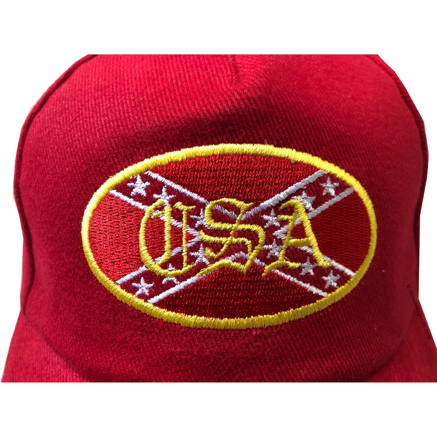 This hat is red in color and has the Confederate flag with the letters CSA embroidered on the front. The CSA stands for the Confederate States of America.